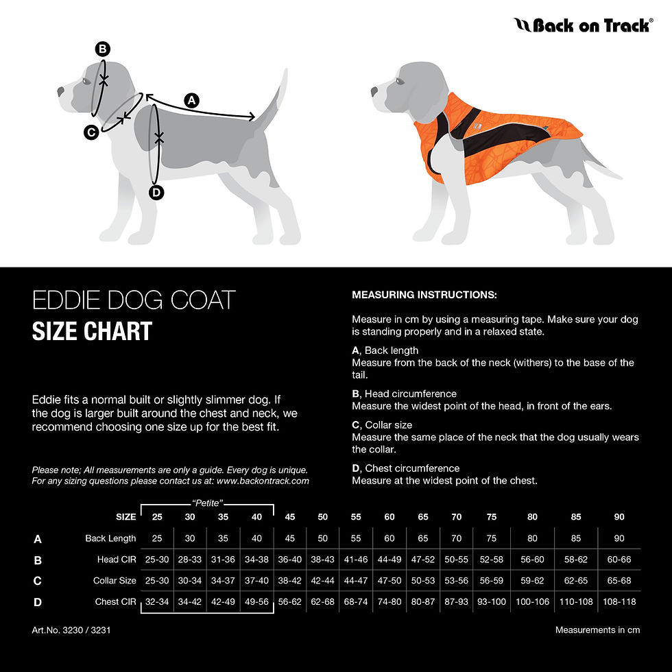 SIZING NOTE: I am using Natural Dawg model, Tennessen, as an example. Tennessen is a Border Collie with a 24" back length, measured using the Back on Track measurement guidelines. He wears a 24" in the Nella Coat, a 59cm in the Mesh Coat, a 63cm in the Standard Dog Coat (though a 59cm would fit him as well), and a 60cm in the Cool on Track Coat.